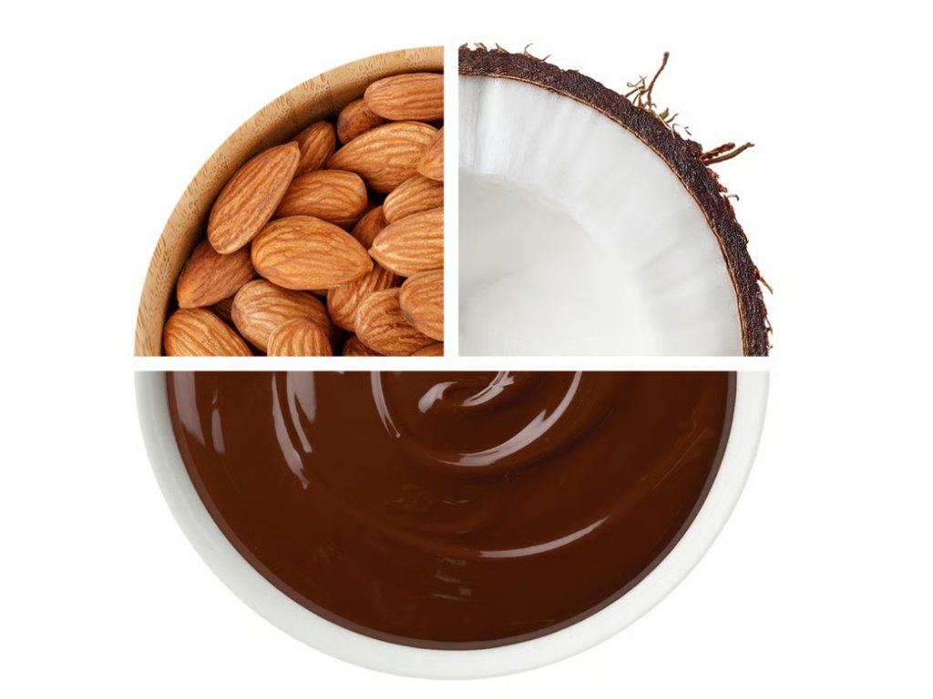 Arašídy, glukózový sirup, sójový extrudát (sójový proteinový izolát, tapiokový škrob, sůl), hořká čokoláda 12 % (kakaová hmota, cukr, kakaové máslo, kakao, emulgátory sójový lecitin a polyglycerolpolyricinoleát, vanilkový extrakt), mandle 8 %, kokos 8 % (kokos, antioxidant oxid siřičitý), fruktóza, med 3 %, emulgátor řepkový lecitin, aroma. Může obsahovat stopy i jiných druhů ořechů a sezamu.