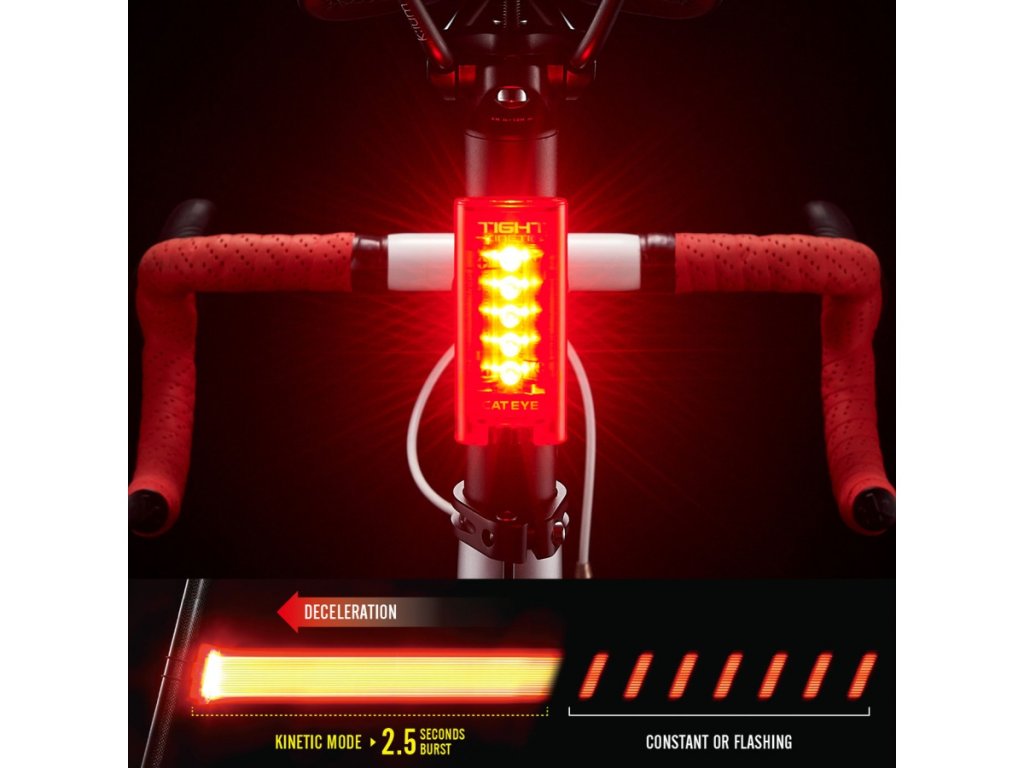 Zadní výkonné světlo - blikačka CATEYE s funkcí brzdového světla a 360° viditelností díky průhlednému tělu světla. Světlo má senzor pro zpomalení a při brzdění se přepne do nejvyšší intenzity svícení (na 2,5s) a upozorní jezdce/řidiče za vámi, že brzdíte. Uchycení se provádí pomocí držáku Flex-Tight (o13-32mm). 3 režimy svícení (konstantní a 2x blikání). Doba svícení: až 70h - konstantní svícení, až 160h - blikačka. Zdroj 2xLR-03 (AAA) alkalické baterie - jsou přiloženy.